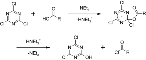 - ↑ K. Venkataraman, and D. R. Wagle (1979). «Cyanuric chloride : a useful reagent for converting carboxylic acids into chlorides, esters, amides and peptides». Tetrahedron Lett. 20 (32): 3037-3040. doi:10.1016/S0040-4039(00)71006-9.