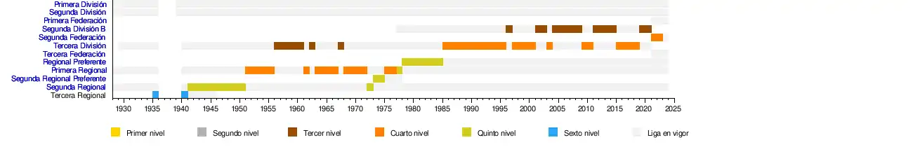 | 2019-20 | 2.ªB | 18.º | 28 | 9 | 5 | 14 | 26 | 37 | 32 | 1.ª ronda | Oliverio Álvarez "Oli" | Luis Gallego González | Álex Arias (10) |