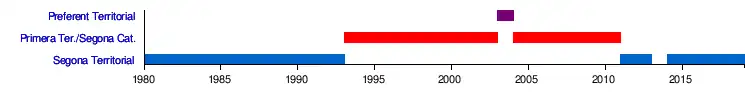 Desde 1980 hasta 2019, el club ha militado 19 temporadas enTercera Catalana, 18 en Segunda Catalana y una en Primera catalana de fútbol[7]