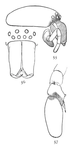 ![]() 55, cabeza de hembra, mostrando las mandíbulas hinchadas. 56, cabeza y mandíbulas de macho. 57, palpos de macho. | ||