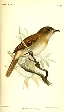 - ↑ a b Sclater, P.L. (1860). «List of Birds collected by Mr. Fraser at Babahoyo in Ecuador, with Descriptions of New Species». Proceedings of the Zoological Society of London (en latín e inglés). 28(2): 272–290. Cyclorhynchus subbrunneus sp. nov., p.282 n.º 60. Disponible en Biodiversitas Heritage Library. ISSN 0370-2774.