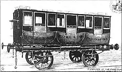 Al comienzo de la era ferroviaria en Inglaterra, generalmente se agregaban dos o tres compartimentos de diligencia sobre un bastidor ferroviario. El uso de las antiguas diligencias se eligió por razones de sencillez, ya que simplemente no existía una industria dedicada a la construcción de coches ferroviarios. Por lo tanto, en el siglo XIX, este tipo de vehículo también se denominó "coche de pasajeros del sistema inglés" (coches cortos compartimentados de dos y tres ejes), en contraste con los "coches abiertos" con un solo habitáculo y un pasillo central conocidos como "coches de pasajeros del sistema americano" (generalmente coches largos de cuatro ejes con pasillo y con plataformas abiertas al final del coche).