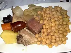 El cocido madrileño es uno de los platos más representativos de la cocina de Madrid.[1] Consiste en un guiso cuyo ingrediente principal son los garbanzos y los secundarios, aunque con gran protagonismo, diversas verduras, carnes y tocino de cerdo con algún embutido. Su origen es humilde y era consumido inicialmente por clases más bajas,[2] llegando poco a poco a la alta sociedad debido a su inclusión en los menús de los restaurantes.[3] Comparte origen con el "cocido montañés" o el cocido maragato, entre otros cocidos y potajes que se realizan en toda la geografía española, y algunos autores lo consideran evolución del cuscús bereber, otros de la olla podrida y otros de la adafina hebrea y culetraba. La popularidad de esta receta se ha extendido desde Madrid al resto de España.[4] El garbanzo fue introducido en España en la época de Cartago y posteriormente utilizado en los cocidos sefarditas de la edad medieval.[1]