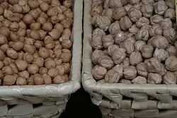 El garbanzo es la única legumbre empleada en el cocido madrileño. Por regla general el garbanzo se recolecta en primavera y se seca lentamente al aire en sus propias vainas, en ramos que se cuelgan en sitios aireados. A comienzos de otoño se maja y se separa la planta del fruto, operación que en Castilla suele hacerse en las eras. Esta operación de lenta desecación hace que se conserve durante largos períodos sin merna de sus cualidades organolépticas. En Madrid para la elaboración del cocido se tiene en gran valoración el garbanzo de la localidad zamorana de Fuentesaúco, suele tener un tamaño mediano o grande con surcos marcados y pico curvo pronunciado.[20] El color de este garbanzo oscila entre una gama que va desde amarillo, blanco, marrón. Es famosa la frase: "el garbanzo y el buen ladrón de Fuentesaúco son". En menos medida se emplea el denominado castellano. Este garbanzo por su sequedad suele ponerse en remojo en una ligera salmuera unas horas antes (generalmente se pone la misma agua de remojo que el salazón que se empleara). El tiempo de remojo suelen ir desde un periodo que va dese las diez hasta las doce horas, dependiendo de la calidad y tamaño del garbanzo. En el argot madrileño se les denominaba gabrieles o grabieles.[20] La dosis media para emplear en el cocido es de mínimo cincuenta gramos de garbanzos por persona, pudiendo llegar a setenta según sea el contenido cárnico.
