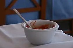 Algunos autores mencionan en paralelo con la elaboración del cocido la preparación de una especie de condimento parecido a una salsa de tomate que suele acompañar el segundo vuelco de garbanzos y verduras. Este condimento es muy habitual en el cocido madrileño. Se suele elaborar con tomates picados que se calientan con ajo y comino molido para que aromatice el condimento.[20] Cuando está todo bien deshecho se pasa por un colador chino, y se espesa con el puré de unos pocos garbanzos empleados durante la cocción. Se suele servir aparte en una pequeña salsera y los comensales lo suelen emplear en pequeñas dosis en el vuelco de los garbanzos y verduras.