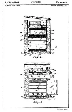 En noviembre de 1905, David Carl Smith, ingeniero municipal de Ingeniería eléctrica en Kalgoorlie, Australia Occidental, solicitó una patente (Aust. Patente No. 4699/05) para un dispositivo que adaptó (a partir del diseño de una estufa de gas) lo que luego se convirtió en la configuración para la mayoría de las cocinas eléctricas: un horno sobre el cual había una placa de cocción con una parrilla entre ellos. La cocina de Carl Smith no tenía termostato; el calor fue controlado por la cantidad de dispositivos de nueve elementos que se incluyeron.[9]