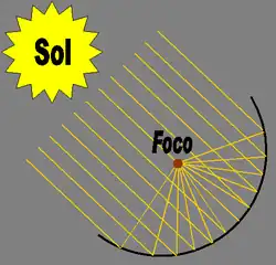 La dirección de propagación de una onda se representa mediante líneas que se denominan rayos y según la forma de la superficie en la que inciden así será la dirección de los rayos reflejados. Cuando la forma de dicha superficie es parabólica todos los rayos que llegan paralelos al eje de la parábola se reflejan pasando por un mismo punto que se denomina foco. Esta es la propiedad fundamental en que se basan todos los ingenios parabólicos.
