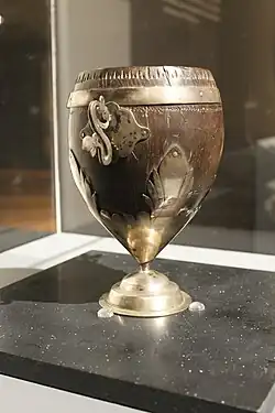 Su elaboración durante el periodo del Virreinato se hizo posible gracias a que las palmas cocoteras naturales de las islas del Pacífico, se aclimataron a otros sitios. Las duras cortezas de sus frutos se limpiaban y tallaban hasta pulirse, luego se esgrafiaban con un buril o gubia, se decoraban con profusas formas vegetales geométricas y se montaban en elaborados trabajos de plata bruñida. El proceso se llevaba a cabo en dos fases: primero el coco era tallado y decorado con aplicaciones de metales, concha y piedras semipreciosas, posteriormente era engarzado en plata, formando un pedestal en el que ocasionalmente se escribía el nombre del poseedor, el año y lugar de manufactura. Estos objetos se fabricaron en América y diferentes lugares de Europa, incluyendo Alemania, España y Francia.[1][2]