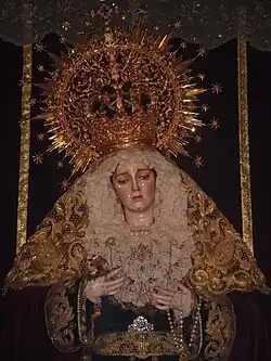 - El trono de la Dolorosa, también fue realizado por Nicolás Prados y es de madera tallada, dorada y policromada. Fue sometido a un proceso de restauración por parte de Rafael Ruíz Liébana en el año 2005, quien saneó su estructura, lo volvió a dorar y remodeló la forma de los arbotantes. La orfebrería del trono provienen de los talleres de Manuel de los Ríos (barras de palio), candelería en alpaca plateada (Orfebrería Triana, 2005) y ánforas (Antonio Santos Campanario). En cuanto a los bordados, mencionar que tanto el manto como el palio ochavado fueron bordados por Leopoldo Padilla en 1952 en oro sobre terciopelo azul. El trono de la titular mariana pesa 3600 kg y es portando, al igual que el del señor, por 220 hombres de trono.