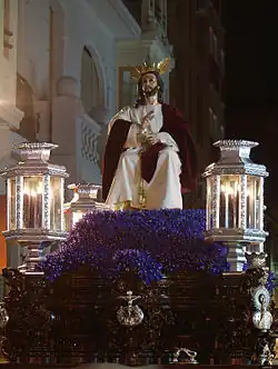 El Paso, de estilo barroco, fue diseñado por el tallista sevillano don Juan Mayorga, quien talló algunas partes de la canastilla. El año 2002 se terminó de tallar y barnizar por don Manuel Montañés. En este Paso se distingue: el monte, que es la parte sobre la que va situada la imagen y que va cubierto de iris morado. La canastilla, realizada en madera de caoba y tallada a mano, va formando vueltas y contravueltas, con partes cinceladas en relieve y otras caladas. El respiradero, también de madera de caoba, tallado con partes en relieve y otras caladas. El conjunto va iluminado por cuatro faroles plateados que rematan cada una de las esquinas de la canastilla y que llevan en su interior cuatro cirios morados cada uno.