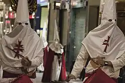 La Hermandad del Stmo. Cristo de la Salud, capuz y túnica blanca con capa y fajín rojos. La Hermandad de la Virgen del Primer Dolor invierte los colores (capuz y túnica roja y capa y fajín blancos). La Hermandad de Nuestro Padre Jesús de la Merced viste capuz y túnica blanca con capa roja y fajín morado. La Hermandad de San Juan Evangelista, túnica y capuz blanco, capa roja y fajín negro.