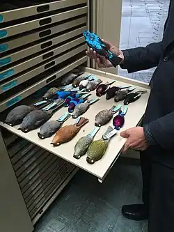 Los primeros ejemplares representan aves que eran mascotas o procedían de zoológicos. Entre los ejemplares de aves más antiguos que se conservan se encuentra un loro gris africano que perteneció a Frances Teresa Stuart (1647-1702) y que fue enterrado con su dueña en la abadía londinense de Westminster.[9] Se han encontrado varios ibis y halcones momificados en tumbas egipcias que datan de entre los años 600 y 300 a. C.[10][11][12] Los ejemplares de aves obtenidos a partir del siglo XVIII para colecciones de historia natural se obtenían en la mayoría de los casos con armas de fuego. Se preferían las escopetas con perdigones de «polvo» para reducir los daños a los especímenes.[13] Hoy en día, los especímenes proceden de diversas fuentes. Muchos (quizá la mayoría) se recuperan de aves muertas por golpes contra ventanas y torres de comunicaciones, gatos domésticos, capturas accidentales de pesquerías, muertes por enfermedades, choques contra vehículos y otras fuentes accidentales de mortalidad. Sin embargo, se ha argumentado que las colecciones de aves del mundo son inadecuadas para documentar la diversidad aviar desde el punto de vista taxonómico, geográfico y temporal, y se considera que algunas partes de las regiones tropicales están infrarrepresentadas en determinados museos.[14] Los taxones infrarrepresentados siguen siendo recolectados activamente por los ornitólogos, generalmente utilizando armas de fuego o redes de niebla. En la mayoría de los países, estas actividades están supervisadas por organismos que conceden permisos.