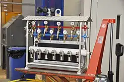 - Colector hidráulico, un componente utilizado para regular los fluidos sel sistema hidráulico, controla la transferencia de potencia entre actuadores y bombas.
