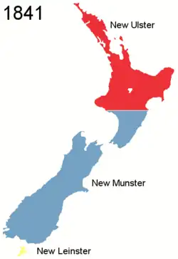 La colonia fue dividida en tres provincias: Nuevo Úlster (la isla Norte), Nuevo Munster (la isla Sur), y Nuevo Leinster (isla Stewart).