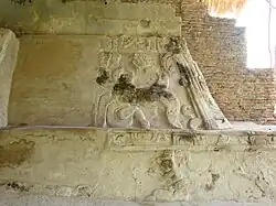 En la esquina sureste del primer cuerpo del basamento, se sobreponen cuatro capas de estuco decoradas con figuras modeladas con el mismo material. Aunque la mayoría de las figuras se encuentran fragmentadas, se conserva en buen estado una figura de un personaje recostado sobre una banca que es tomado de los cabellos por otro individuo del que solo quedan un brazo y las piernas, correspondientes a la segunda capa.[9]