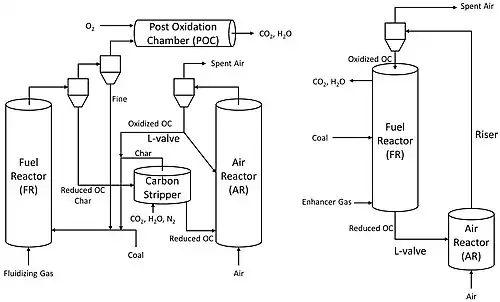 La combustión química en bucle (CLC) es un proceso tecnológico que suele emplear un sistema de lecho fluidizado doble. El CLC operado con un lecho móvil interconectado con un sistema de lecho fluidizado también se ha empleado como un proceso de tecnología. En CLC, se emplea un óxido metálico como material de lecho que proporciona el oxígeno para la combustión en el reactor de combustible. El metal reducido se transfiere luego al segundo lecho (reactor de aire) y se vuelve a oxidar antes de volver a introducirse nuevamente en el reactor de combustible completando el circuito. La figura 1 muestra un diagrama simplificado del proceso CLC. La figura 2 muestra un ejemplo de un sistema de reactor de circulación de doble lecho fluidizado y un sistema de reactor de circulación de lecho fluidizado de lecho móvil.
