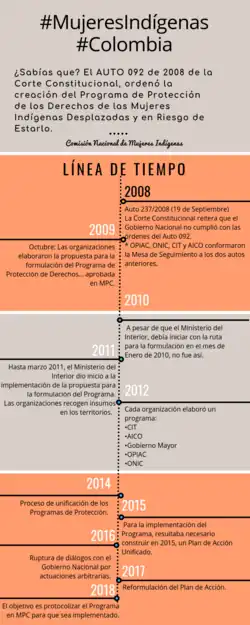 La Comisión Nacional de Mujeres Indígenas, desde su creación en el 2013, ha tenido como función hacer seguimiento a la implementación del Programa de Protección de Derechos de las Mujeres Indígenas desplazadas y en riesgo de estarlo (Auto 092 de 2008). Lo anterior es una contribución a la la efectividad y garantías para el pleno ejercicio de los derechos de las mujeres indígenas en sus territorios.