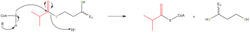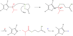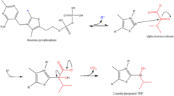 PASO 1: la α-cetoisovalerato se combina con TPP y es entonces descarboxilada.[22] El mecanismo que empuja la dirección de la flecha se muestra en la Figura 3. PASO 2: El 2-metilpropanol-TPP es oxidado para formar un grupo acilo, mientras que es simultáneamente transferido al cofactor lipoil en la subunidad E2.[22] Es de notar que en este paso el TPP es regenerado. El mecanismo que empuja la dirección de la flecha se muestra en la Figura 4.