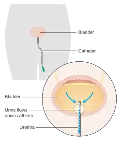 Imagen de un catéter urinario, una causa común de infecciones asociadas a la atención médica. - Infecciones asociadas a la atención médica (HAI): las HAI son complicaciones de tratamientos generales que involucran microorganismos o infecciones virales y son causadas más comúnmente por dispositivos permanentes (catéteres urinarios, vías centrales) o procedimientos quirúrgicos previos.[4] Los microbios comunes involucrados en las HAI son Escherichia coli, Proteus mirabilis,[5] y Clostridium difficile. La medida preventiva más efectiva es la higiene de manos.[6]