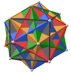 El compuesto es un facetado de un dodecaedro (donde se pueden ver pentagramas en correlación con las caras pentagonales). Cada cubo representa una selección de 8 de los 20 vértices del dodecaedro.
