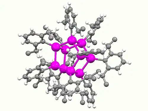 Incluso se han caracterizado los penta- y hexaorganostannatos(IV) totalmente orgánicos,[21] mientras que en el año posterior se informó de un compuesto de tetraorganoestaño hexa-coordinado.[22] Se informó de una estructura cristalina de pentaorganostannato(IV) totalmente carbonado estable a temperatura ambiente (en argón) como la sal de litio con esta estructura:[23]