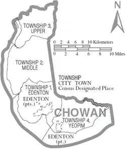 - Esta obra contiene una traducción derivada de «Chowan County, North Carolina» de Wikipedia en inglés, publicada por sus editores bajo la Licencia de documentación libre de GNU y la Licencia Creative Commons Atribución-CompartirIgual 4.0 Internacional.
