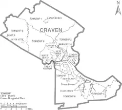 - Esta obra contiene una traducción derivada de «Craven County, North Carolina» de Wikipedia en inglés, publicada por sus editores bajo la Licencia de documentación libre de GNU y la Licencia Creative Commons Atribución-CompartirIgual 4.0 Internacional.