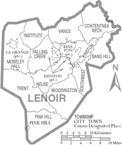 El condado se divide en doce municipios: Municipio de Contentnea Neck, Municipio de Falling Creek, Municipio de Institute, Municipio de Kinston, Municipio de Moseley Hall, Municipio de Neuse, Municipio de Pink Hill, Municipio de Sand Hill, Municipio de Southwest, Municipio de Trent, Municipio de Vance y Municipio de Woodington.