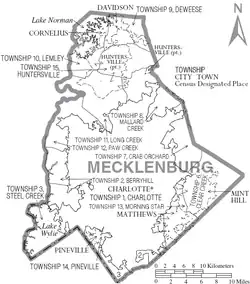 - Esta obra contiene una traducción derivada de «Mecklenburg County, North Carolina» de Wikipedia en inglés, publicada por sus editores bajo la Licencia de documentación libre de GNU y la Licencia Creative Commons Atribución-CompartirIgual 4.0 Internacional.