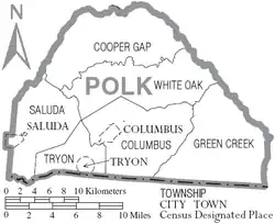 El condado se divide en seis municipios: Municipio de Columbus, Municipio de Cooper Gap, Municipio de Green Creek, Municipio de Saluda, Municipio de Tryon y Municipio de White Oak.