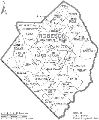 - Esta obra contiene una traducción derivada de «Robeson County, North Carolina» de Wikipedia en inglés, publicada por sus editores bajo la Licencia de documentación libre de GNU y la Licencia Creative Commons Atribución-CompartirIgual 4.0 Internacional.