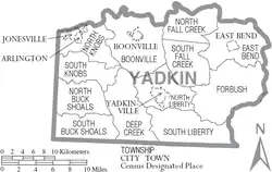 Municipio de Boonville, Municipio de Deep Creek, Municipio de East Bend, Municipio de Forbush, Municipio de North Buck Shoals, Municipio de North Fall Creek, Municipio de North Knobs, Municipio de North Liberty, Municipio de South Buck Shoals, Municipio de South Fall Creek, Municipio de South Knobs y Municipio de South Liberty.