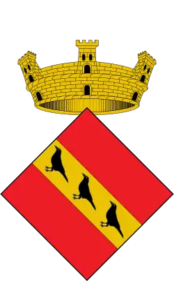 Escudo partido: 1º, de azur, una torre de plata de la que sale la copa de un árbol de sinople sumado de un pájaro al natural. 2º, de oro, un castillo de gules aclarado de azur y un tigre de azur entrando por su puerta.[8]