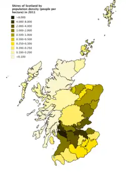 En Escocia, al igual que en Inglaterra y Gales, los términos "shire" y "county" se han utilizado indistintamente, siendo este último más común en el uso posterior. Hoy en día, el término "condado" se utiliza más comúnmente, considerándose "shire" como una variante más poética o arcaica.[cita requerida]