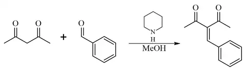 En donde el electroatractor Z puede ser un carbonilo (cetona, éster o menos común, aldehído), nitro (-NO2) o nitrilo (-CN) Debido a que el carbono intermedio entre ambos carbonilos es más ácido, la condensación se lleva a cabo en condiciones básicas más suaves, por lo general en presencia de una amina no nucleofílica, en la forma de clorhidrato o acetato de la misma.[13]