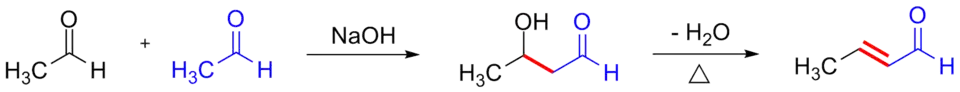 La condensación aldólica consta en realidad de dos reacciones que ocurren in situ: primero se forma un β-hidroxialdehído (aldol) o una β-hidroxicetona conforme a la reacción aldólica. Corrientemente, se obtiene un sistema conjugado de un carbonilo α,β-insaturado como producto final, a través de la deshidratación del intermedio, pero también es posible reiterar la condensación y dar lugar a polímeros.[1]