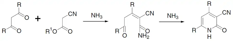 En otro método de síntesis similar, la síntesis de piridonas de Guareschi Thorpe, el primer intermediario es una condensación de Knoevenagel de una β-cianoamida con un sistema β-dicarbonílico en presencia de amoniaco[28]
