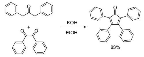 Se ha reportado la síntesis de ciclopentadienonas por dos condensaciones aldólicas cruzadas consecutivas, la primera intermolecular y la segunda intramolecular, a partir de una cetona con dos hidrógenos α y un sistema 1,2-dicarbonílico. Como ejemplo se ilustra la formación de tetrafenilciclopentadienona a partir de difenilacetona y difeniletanodiona:[22]