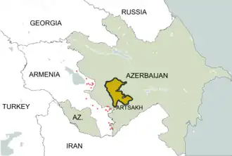 ![]() Mapa de los bombardeos por las Fuerzas Armadas de Azerbaiyán marcados en rojo | ||||