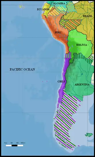 - Guerra del Pacífico (1879–1884): Fue un conflicto armado que enfrentó a la República de Chile contra las repúblicas del Perú y de Bolivia. El resultado fue la anexión a Chile del Departamento de Antofagasta, Bolivia; y del Departamento de Tarapacá y la Provincia de Arica (Perú).