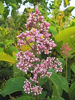 Son arbustos que alcanzan un tamaño de 1–3 m de alto; ramitas distales, pecíolos, nervios principales y de orden mayor del envés de la hoja, inflorescencias y yemas florales moderadamente estrellado-pubescentes. Hojas ovadas a ovado-oblongas, 9–25 cm de largo y (4–) 8–17.5 cm de ancho, ápice agudo a cortamente acuminado, base redondeada a subcordada, margen ciliado-serrado, moderada a copiosamente cubiertas de tricomas lisos patentes en la haz, (5–) 7–9-plinervias. Inflorescencias 9.5–20 cm de largo, pedicelos 2–3 mm de largo, bractéolas linear-lanceoladas a subuladas, 1–1.5 mm de largo y 0.25 mm de ancho, subpersistentes, yemas florales elipsoides a oblongo-ovoides, 4–6 mm de largo; caliptra 2.5–3 mm de largo, consistentemente aguda; pétalos 5, 4–5 mm de largo y 2–3.5 mm de ancho, rosados pero amarillo-verdosos cuando secos; estambres 10, filamentos 2–3 mm de largo, tecas 2.5 mm de largo; estigma claviforme a capitado, 0.5 mm de diámetro, ovario 5-locular, sin cono ni collar. Semillas obovoides a piramidales, 1–1.5 mm de largo.[1]