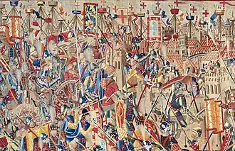 A finales del siglo XV se encargó un conjunto de cuatro grandes tapices para conmemorar la batalla. Fueron tejidos por tejedores flamencos en Tournai, Bélgica. Los tapices destacan por su representación de un acontecimiento contemporáneo. Las obras están consideradas entre los mejores tapices góticos que existen.[2]