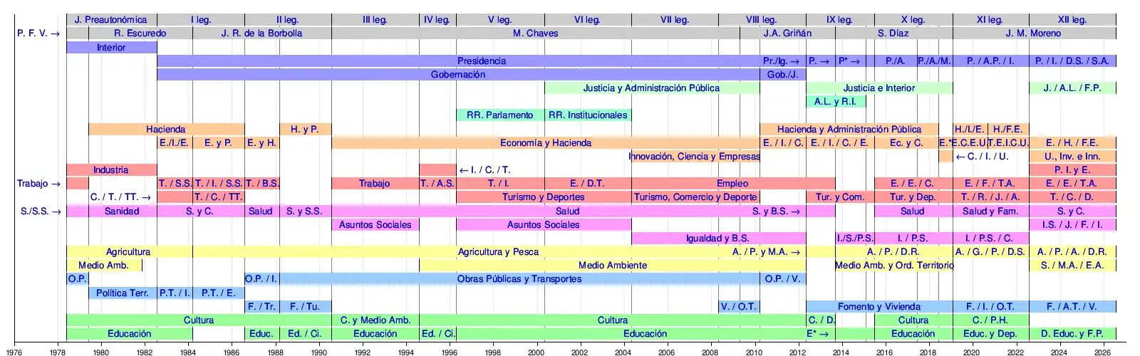 Abreviaturas utilizadas: A. / P. / A. / D.R. - Agricultura, Pesca, Agua y Desarrollo Rural; A.L. y R.I. - Administración Local y Relaciones Institucionales; A./G./P./D.R. - Agricultura, Ganadería, Pesca y Desarrollo Sostenible; A. / P. y M.A. - Agricultura, Pesca y Medio Ambiente; A. / P. / D.R. - Agricultura, Pesca y Desarrollo Rural; C. / D. - Cultura y Deporte; C. / I. / U. - Conocimiento, Investigación y Universidad; C. / P.H. - Cultura y Patrimonio Histórico; C. / T. / TT. - Comercio, Turismo y Transportes; C. y Medio Amb. - Cultura y Medio Ambiente; D. Educ. y F.P. - Desarrollo Educativo y Formación Profesional; E* - Economía, Hacienda y Administración Pública; E. / C. / D. - Educación, Cultura y Deporte; E. / C. / E. / U. - Economía, Conocimiento, Empresas y Universidad; Ec. y C. - Economía y Conocimiento; Ed. / Ci. - Educación y Ciencia; E. / D.T. - Empleo y Desarrollo Tecnológico; Educ. - Educación; Educ. y Dep. - Educación y Deporte; E. / E. / C. - Empleo, Empresa y Comercio; E. / E. / T.A. - Empleo, Empresa y Trabajo Autónomo; E. / F. / T.A. - Empleo, Formación y Trabajo Autónomo; E. / H. / A. - Economía, Hacienda y Administración Pública; E. / H. / F.E. - Economía, Hacienda y Fondos Europeos; E. / I. / C. - Economía, Innovación y Ciencia; E. / I. / C. / E. - Economía, Innovación, Ciencia y Empleo; E./I./E. - Economía, Industria y Energía; E. y H. - Economía y Hacienda; E. y P. - Economía y Planificación; F. / A.T. / V. - Fomento, Articulación del Territorio y Vivienda de la Junta de Andalucía; F. / I. / O.T. - Fomento, Infraestructuras y Ordenación del Territorio; F. / Tr. - Fomento y Trabajo; F. / Tu. - Fomento y Turismo; F. / V. - Fomento y Vivienda; Gob./J. - Gobernación y Justicia; H./F.E. - Hacienda y Financiación Europea; H. / I. / E. - Hacienda, Industria y Energía; H. y P. - Hacienda y Planificación; I. / C. / T. - Industria, Comercio y Turismo; Igualdad y B.S. - Igualdad y Bienestar Social; I.S. / J. / F. / I. - Integración Social, Juventud, Familias e Igualdad I. / P.S. - Igualdad y Políticas Sociales; I. / P.S. / C. - Igualdad, Políticas Sociales y Conciliación; I./S./P.S. - Igualdad, Salud y Políticas Sociales; J. / A.L. / F.P. - Justicia, Administración Local y Función Pública; Medio Amb. y Ord. Territorio - Medio Ambiente y Ordenación del Territorio; O.P. - Obras Públicas; O.P. / I. - Obras Públicas e Infraestructuras; O.P. / V. - Obras Públicas y Vivienda; P. - Presidencia; P* - Presidencia, Administración Local y Relaciones Institucionales; P./A. - Presidencia y Administración Local; P./A./M. - Presidencia, Administración Local y Memoria Democrática; P./A.P./I. - Presidencia, Administraciones Públicas e Interior; P. I. y E. - Política Industrial y Energía de la Junta de Andalucía; P./I./D.S./S.A. - Presidencia, Interior, Diálogo Social y Simplificación Administrativa; Política Terr. - Política Territorial; Pr./Ig. - Presidencia e Igualdad; P.T. / E. - Política Territorial y Energía; P.T. / I. - Política Territorial e Infraestructura; RR. Parlamento - Relaciones con el Parlamento; RR. Institucionales - Relaciones Institucionales; Salud y Fam. - Salud y Familias; S./M.A./E.A. - Sostenibilidad, Medio Ambiente y Economía Azul; S./S.S. - Sanidad y Seguridad Social; S. y B.S. - Salud y Bienestar Social; S. y C. - Salud y Consumo; S. y S.S. - Salud y Servicios Sociales; T. / A.S. - Trabajo y Asuntos Sociales; T. / B.S. - Trabajo y Bienestar Social; T. / C. / D. - Turismo, Cultura y Deporte; T. / C. / TT. - Turismo, Comercio y Transportes; T.E./I./C./U. - Transformación Económica, Industria, Conocimiento y Universidades; T. / I. - Trabajo e Industria; T. / I. / S.S. - Trabajo, Industria y Seguridad Social; T. / R. / J. / A. - Turismo, Regeneración, Justicia y Administración Local; T. / S.S. - Trabajo y Seguridad Social; Tur. y Com. - Turismo y Comercio; Tur. y Dep. - Turismo y Deportes; U., Inv. e Inn. - Universidad, Investigación e Innovación; V. / O.T. - Vivienda y Ordenación del Territorio