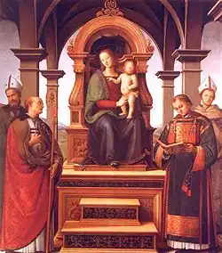 Virgen María y Niño Jesús, con los santos Luis de Toulouse, San Lorenzo, Herculano de Brescia, y Constancio de Perugia. Pietro Perugino, 1497. | |||