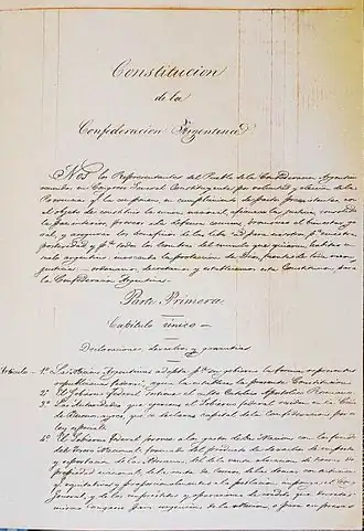 La Constitución de la Nación Argentina, que rige actualmente a la República Argentina, fue aprobada por una asamblea constituyente integrada por representantes de trece provincias, hecha en la ciudad de Santa Fe en el año 1853. El propósito de la Constitución de 1853 fue poner fin al ciclo de las guerras civiles y sentar las bases de la «unión nacional» mediante un régimen republicano y federal. Antes de esta Constitución hubo dos intentos constituyentes en 1819 y 1826, que no prosperaron por carecer de consenso entre las provincias. Con posterioridad otras diez provincias y una ciudad integraron la federación.