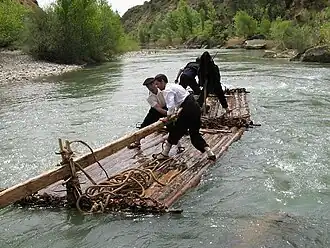 - Remando con pagaies en las balsas formadas por una plataforma con varios odres.