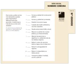 Las preguntas se encuentran repartidas a través de tres páginas o papeletas (en el caso del voto convencional). La primera página intenta medir la aprobación hacia una nueva Constitución de Chile (y su mecanismo) al igual que la opinión pública en temas de financiamiento de los municipios, corrupción política y un IVA diferenciado a productos de primera necesidad; la segunda intenta identificar las demandas sociales (listando 11), y la tercera es una página abierta a preguntas específicas de cada municipio.