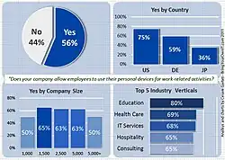 Los datos muestran que la mayoría de las empresas encuestadas ya permiten que sus empleados puedan utilizar sus dispositivos personales para actividades relacionadas con el trabajo. En total, el 56% de los encuestados se muestran a favor de la consumerización debido a que los usuarios finales prefieren los dispositivos personales ya que son más fácil de usar, más convenientes y les permiten mezclar su vida personal y laboral. Si bien la tendencia está afectando claramente a las organizaciones de todo el mundo, no todas las regiones se han adaptado al mismo ritmo: los EE. UU. ya lidera esta innovación con un 75% de aceptación, el más conservador, Japón, está en la subida con un 36% y Alemania está en un punto intermedio con un 59%. Desde una perspectiva de la industria vertical, el sector educativo (80%), Salud (69%) y servicios empresariales (67%) son los sectores más consumerizados mientras que la manufactura (48%), Gobierno (39%) y las empresas de servicios públicos (36%) son los más lentos para acoger la tecnología de consumo. El tamaño de la empresa no parece ser un factor de descarte, a pesar de que las medianas y grandes empresas muestran mayores tasas de aceptación, de hasta el 65% para las empresas con 1 500 empleados.