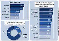 La Seguridad (64%) y la pérdida de datos (59%) siguen siendo las principales preocupaciones de la mayoría de las empresas que permiten a los empleados a llevar sus dispositivos personales al trabajo. Las implicaciones de cumplimiento y legales son la mayor preocupación en los EE. UU. y en Japón, que en Alemania. Para reducir los riesgos de seguridad y disminuir los costos de gestión, el 79% de los encuestados exigen a los empleados instalar soluciones de seguridad móvil en sus dispositivos móviles personales. El 69% de los encuestados coincidieron en que la seguridad del dispositivo móvil es un componente clave en la protección de sus entornos de IT de las amenazas de los dispositivos móviles de los consumidores, mientras que el 71% de los encuestados considera una combinación de seguridad móvil y gestión de dispositivos móviles como la más eficaz.