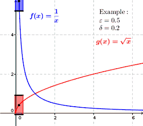 Por ejemplo, la función definida para de la imagen de abajo a la derecha no es uniformemente continua (aunque sí que es continua). Para ver esto, nótese que para conseguir un mismo error en las imágenes de la función, para puntos cercanos a 0 debemos restringir los puntos considerados a distancias infinitamente pequeñas; no existe pues una misma distancia que sirva para todos: para cualquier supuesta distancia que sirviera, podríamos encontrar puntos (cercanos a 0) para los cuales los valores de la función en un entorno de diámetro alrededor del punto variaran tanto como queramos.